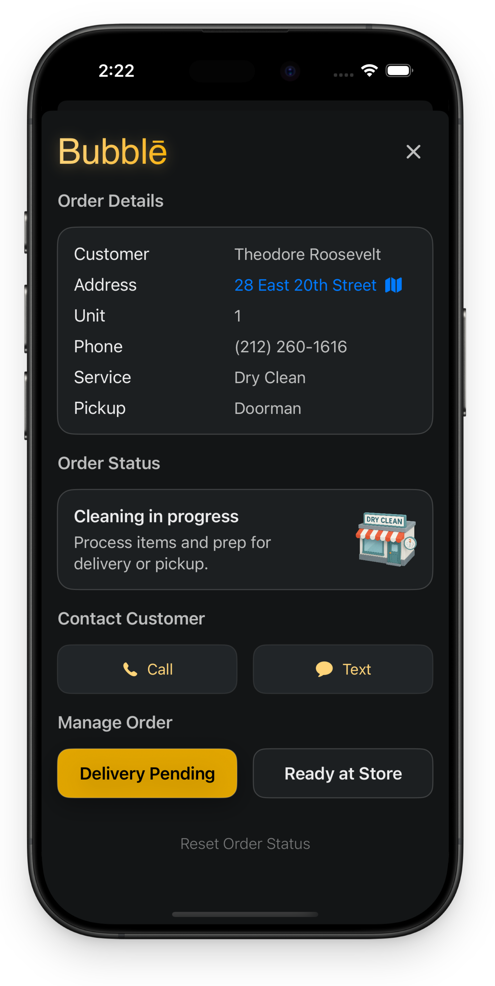 With Bubblē, you get clear incoming orders, easy status updates, and fewer phone calls, texts, and walk-ins asking “Is my laundry ready?”